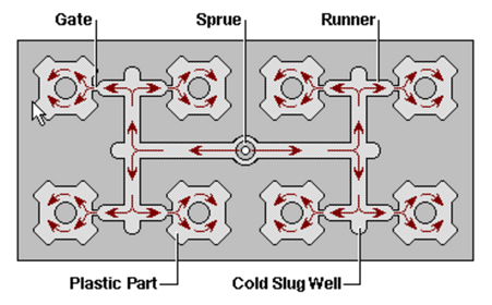 A sprue is simply the channel that guides molten plastic from the nozzle of the injection molding machine to the entry point for the entire injection mold tool. It is a separate part from the mold tool itself. A runner is a system of channels that meet up with the sprue, typically within or as part of the mold tool, that guides the molten plastic into the part cavities within the mold tool. There are two kinds of runners, hot runner and cold runner. Lastly, the gate is the part of the channel after the runner that leads directly into the part cavity. After an injection mold cycle (typically only seconds long) the entirety of the molten plastic will cool leaving solid plastic in the sprue, runners, gates, part cavities themselves, as well as a little bit of overflow potentially on the edges of the parts (if the seal isn't 100% right).